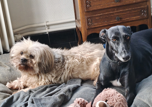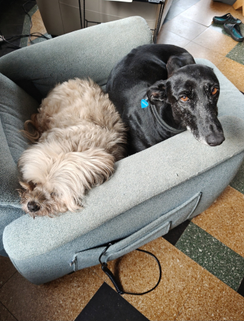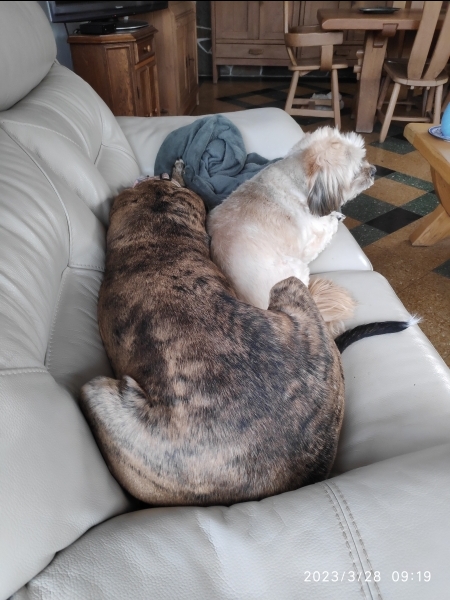 Riri a perdu sa copine Nina, morte le 25.11.23 de la leishmaniose malgré son traitement. Actuellement son nouveau copain s'appelle Rox (voir photo).