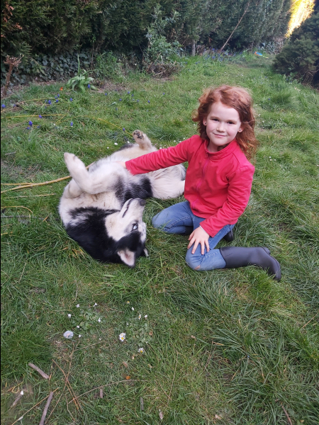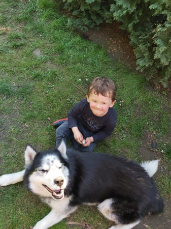 Bandy écoute de mieux en mieux, c'est une perle avec les enfants et il ne nous a pour le moment fait aucun dégât. Le petit chien du voisin aboit après lui mais Bandy le nargue. Il a bon appétit et adore les friandises. Les jeux ne sont pas son fort, mais une bouteille en plastique vide, la par contre il est tout fou !