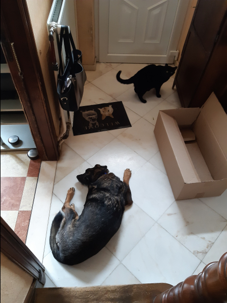 Comme vous le verrez sur les photos, il s'entend bien avec les chats, avec Fû et avec les personnes qui passent à la maison.