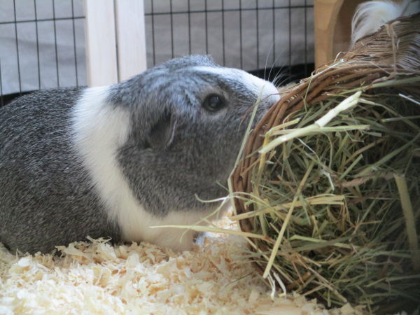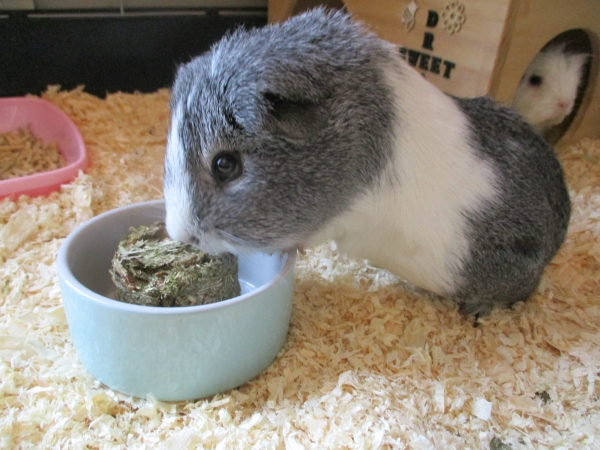 Elle a découvert sa nouvelle maisonnette, a vite trouvé ses écuelles de verdure et d'extrudés ainsi que son foin.