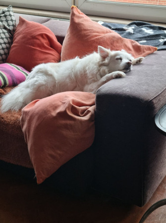 Pari tenu câline et Tyka sont les meilleures amies du monde ! Elles jouent dans le jardin et se poursuivent mutuellement. Câline s?adapte très bien à sa nouvelle maison. Il reste du travail du côté de la propreté, mais elle est encore jeune. Elle se colle à tout le monde et elle est demanderesse de caresses. En résumé, elle est un petit c?ur !