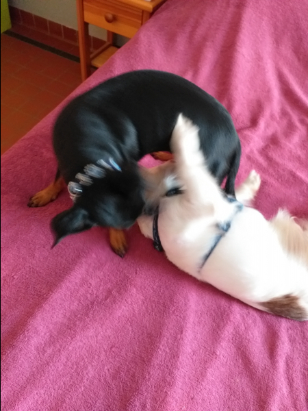 salut mes amis , voici une semaine que ma nouvelle maman est venue m'adopter au refuge , c'est vrai j'avais un peu peur mais j'ai été vite rassuré , maintenant j'ai une grande s?ur qui est malade alors je fais tout doucement et durant les promenades je reste a coté d'elle je marche lentement et ça la rassure, mais pour jouer et faire des bêtises j'ai ma petite voisine (on a la même taille ), et avec le chat aussi je joue , en tout cas je ne m'ennuie jamais j'ai un jardin je fais beaucoup de promenades, je pars en voiture je fais de nouvelles rencontres ,ma maman est vraiment fière de moi car je suis très sage , propre et très câlin,mais attention!!! quand je fais des bisous on ne m'arrête plus, merci à toutes les personnes du refuge qui se sont occupées de moi ,grosses bises( léchouilles )de Charly