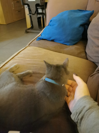 Je trouve donc place dans les placards ou en dessous de ceux-ci. Quand il fait calme, je visite ma nouvelle maison, je mange etc... J'adore les petits bonbons que mes humains me donnent et je ronronne quand ils me caressent et je m'endors avec celles-ci.