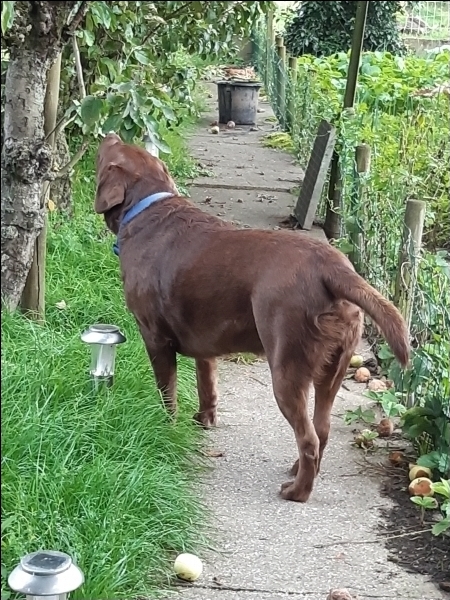 Hihi, hier, c'était mon anniversaire ! Yes, deux beaux jouets en plus ! Vous verrez sur la photo que je n'en manque pas, mais deux de plus, j'ai adoré ! Alors comme je place ma source de plaisir dans mon estomac (comme tout bon labrador !), il y a 2 jours, j'ai eu une lichette de glace avec une lichette de crème fraîche, hier j'ai eu du jambon sur les deux petits morceaux de pain que mes maîtres me donnent après leurs repas. Alors, le soir, une pâtée comme je les aime : croquettes, haricots, pâtes blanches et des morceaux de carbonade de boeuf maigre ! Oh, c'est bon ! Evidemment, en plus, j'ai quelques nic-nacs, des dés de blanc de poulet, un dentastix...Oui, je sais, ce n'est pas un régime amaigrissant à conseiller mais je ne suis pas gros, je suis juste un peu enrobé ! Et puis, je marche beaucoup.