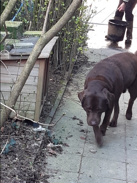 Je suis overbooké ! Je surveille car dehors, il y a des messieurs qui cassent ma rue. Quelle affaire, du bruit, des grosses machines, de la crasse...Mais mon maître et moi savons quand même passer pour aller promener ! Sur la photo, je suis dans mon jardin. J'assiste mon maître qui arrache les mauvaises herbes ! En cas de besoin, je suis là !