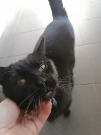 Voici quelques photos d Hadès, il est adorable il a pris sa place dans la famille il est réglé comme une horloge pour les repas et si on n est pas à l heure il nous le fait entendre, il sort dans le jardin mais ne part pas très longtemps il aime dormir sur les lits, je pense qu'il les a déjà tous testé mais son préféré est celui de mon grand. Il ne faut pas s inquiéter pour son collier, il en besoin pour rentrer car il y a un aimant pour la chatière mais si il devait rester coincé le collier s ouvre et ne risque donc pas d être étranglé ouf.Â