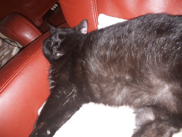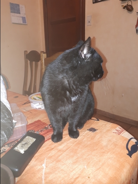 Super début de journée. Après deux jours passés en dessous des fauteuils et derrière les armoires , Noireau s'est formidablement bien adapté. Depuis ce matin il est parti en exploration dans toute la maison et il a compris que ma chienne Leika ne lui voulait absolument aucun mal, ils se sont sentis le bout du nez, et tout s'est bien passé. Il mange bien et a bien trouvé sa litière. Il miaule encore beaucoup mais après tous ces changements pour lui cela peut se comprendre. Patience câlins et douceurs seront les meilleurs remèdes