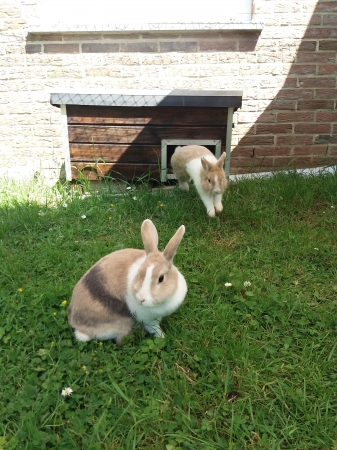 Voici quelques photos de Bounty. Il va très bien, c'est un chouette petit lapin super curieux et amitieux. Il vient toujours dire bonjour et cherche les caresses. Il gambade toute la journée dans son enclos extérieur avec sa copine Noisette.