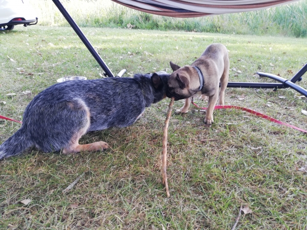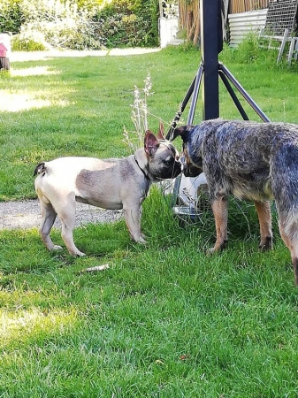 Tout se passe toujours très bien, il adore son copain (chien de ma belle fille Boubou aussi) et sa copine, ils s'entendent super bien et courent partout dans la maison ou le jardin quand ils sont en forme.