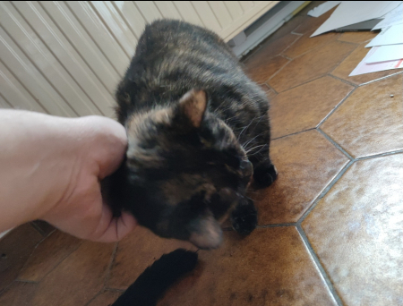 Par contre, tout n'est pas encore rose ; elle a tres peur des mains, meme quand elles tiennent de la nourriture. Je me demande si ce chat n'a pas subit des violence dans sa vie. Et de plus, ca ne va toujours pas trop avec l'autre chat.