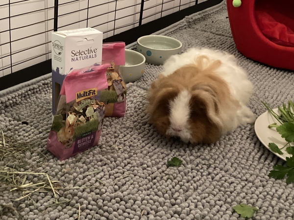 Je vous dis bonjour de ma nouvelle maison et en compagnie de mes deux soeurs. Je suis très calme mais j'adore manger et me fais toujours une petite place dans l'assiette de verdure que j'ai vite appris à aimer!