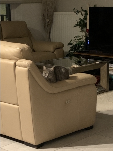 Pour le moment, il nous est impossible de le caresser car il a encore peur. Souvent caché au début, il commence depuis 1 petite semaine à sortir pour se balader dans l'appartement et il aime regarder les voisins via notre baie vitrée.