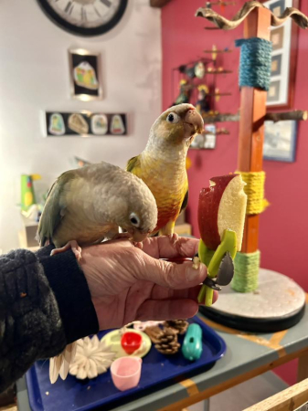 Ca fait maintenant quelques jours que j'ai adopté Naoki et Hakina, les deux Conures à joues vertes et tout se passe pour le mieux. Ils commencent à être à l'aise dans leur maison et nous faisons déjà quelques petits progrès relationnels.