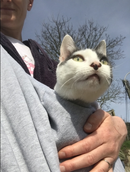 Vaiana a fait sa première balade du printemps à Olne. Bien installée dans son sac, elle a pu profiter du soleil qui réchauffe son petit corps, de nombreux bruits, du vent dans ses poils et a beaucoup observé tout ce qui l'entourait.