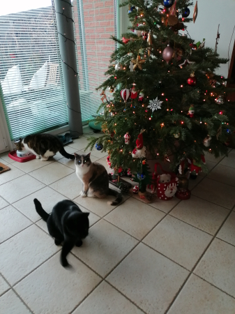 Je profite de ma famille : mes 2 grandes sœurs Croquette que je n'arrive pas à approcher de trop près et Musti que j'ai dépassé en taille.