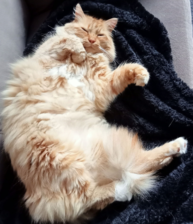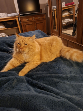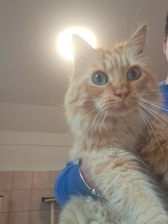 bénévolat. Chaque fois qu'il me voyait, il miaulait très fort. Donc le 4 juillet 2024 j'ai adopté Leo et depuis c'est mon grand nounours que j'aime très fort.