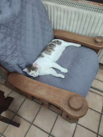Thor vient volontier s'installer sur nos genoux lorsque l'on regarde la télé :) Il prend part aux séances de jeux des petits et est devenu un grand gourmand, il a d'ailleurs déjà pris un peu de poid et devra probablement faire un petit régime un de ces jours :pÂ