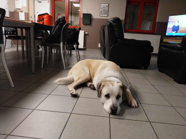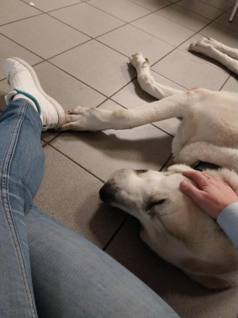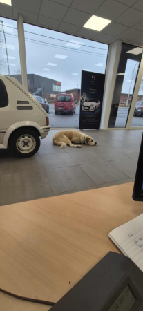 Walace nous accompagne au boulot : il accueille les clients au garage et se fait chouchouter par tout le monde ! Il a également découvert la caserne des pompiers. Il est bel et bien glouton... Pas avec sa gamelle mais la moindre nourriture qu'il repère... Il en fait son affaire. On est obligé de tout cacher et de ne pas manger devant lui... Sinon il réclame notre nourriture. Il n'hésite pas à nous donner sa patte pour qu'on lui donne ce qu'on mange ! Belle soirée