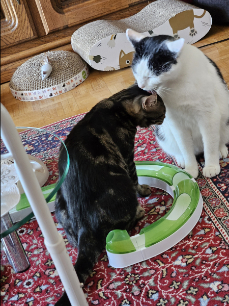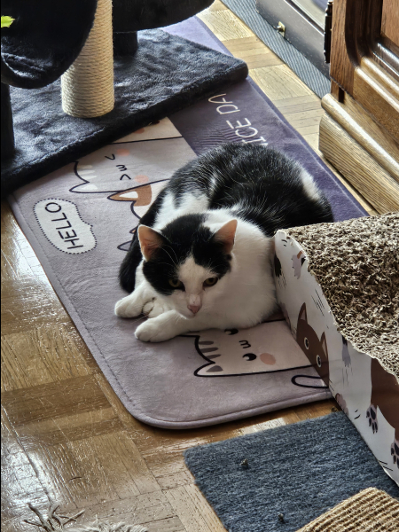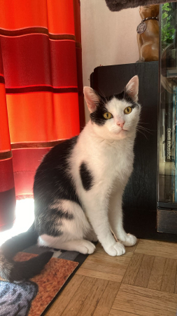 Adorable Flocon, très sage , plutôt calme , un peu peureux , s'entend très bien avec Pupuce ,avec lequel  il joue beaucoup, très gourmand , s'adapte très bien à sa nouvelle vie.