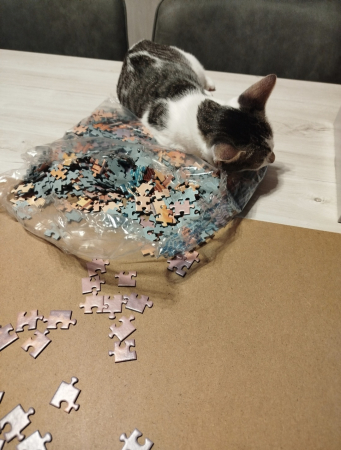 Elle adore sauter partout sur les meubles, sur mes pauvres tentures mais aussi sur ma table de salle à manger et encore plus quand je fais un puzzle, je pense qu'elle ne veut pas que je le termine.Â