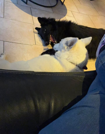 Première sortie dans le quartier après un bon repas Je découvre le monde avec mes amis Moon et Whisky Un peu d’apprentissage et d’ajustement de la meute et ça ira :)