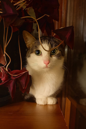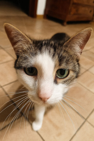 Très apeuré les premiers jours, il a fait d'énormes progrès sur un mois, il mange très bien (très gourmand), il joue, il va dans son arbre à chat, il reste parfois dans la même pièce que nous.