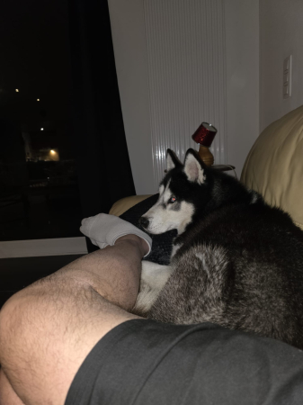 ça va super bien avec le chien, cette nuit aucun bruit, ce matin levé aucun pipi, rien déchiré, et hier soir il était déjà couché à mes pieds dans le fauteuil. Â