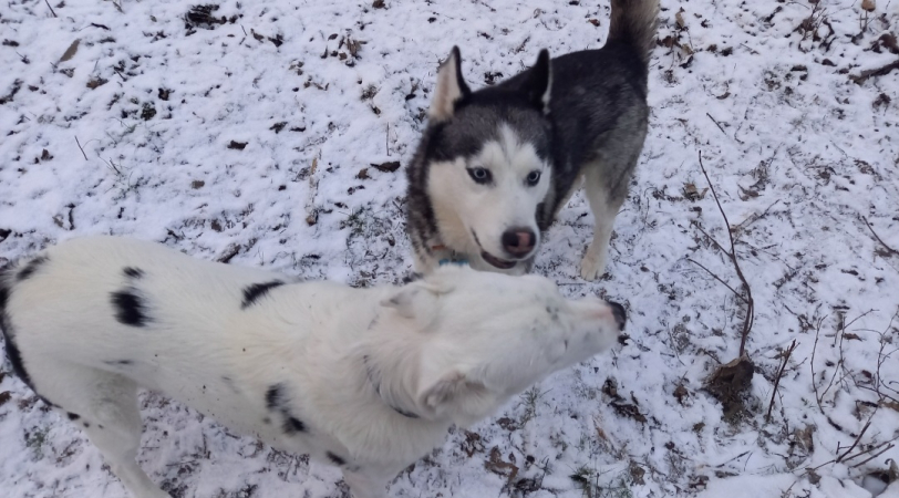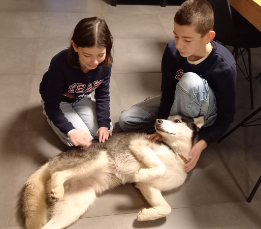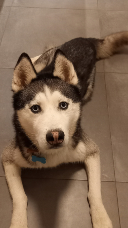 On aurait pu regretter notre choix. C'est un husky, et nous ne nous étions pas informés à propos des particularités de cette race. Mais nous ne regrettons absolument pas d'avoir croisé son regard ce 13 octobre. Il pesait 17kg à son arrivée. Il pèse à présent 23kg. 23kg d'amour qu'il nous offre chaque jour.