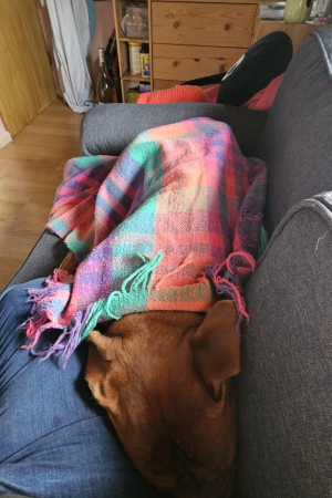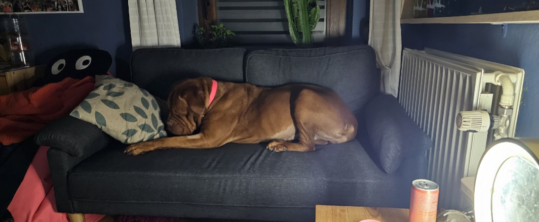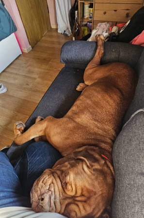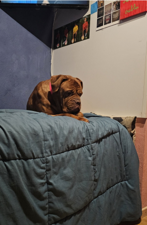 Bella.adore le fauteuil, le lit aussi. En voiture, elle ne bouge pas. En promenade un peu réactive envers les chiens qui sont un peu excités et qui aboient, mais juste un peu de travail et ça ira. Aussi un pot de colle.