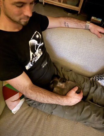 Elle est extrêmement câline et hier soir nous lui avons offert un moment social et papouilles dans le fauteuil: elle s’est endormie sur mon mari.