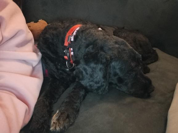 Elle mange et boit bien. Elle accepte la laisse et dort dans le