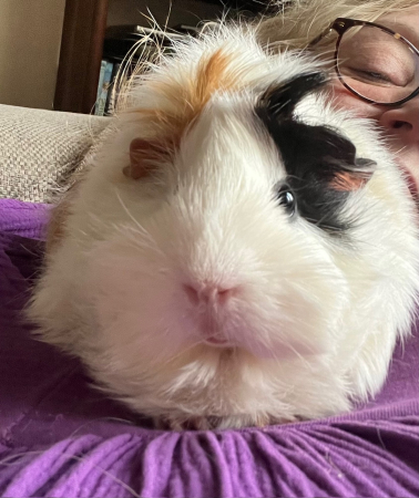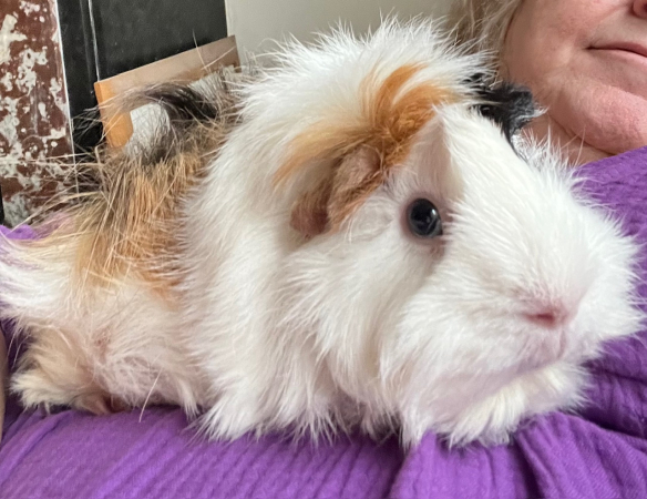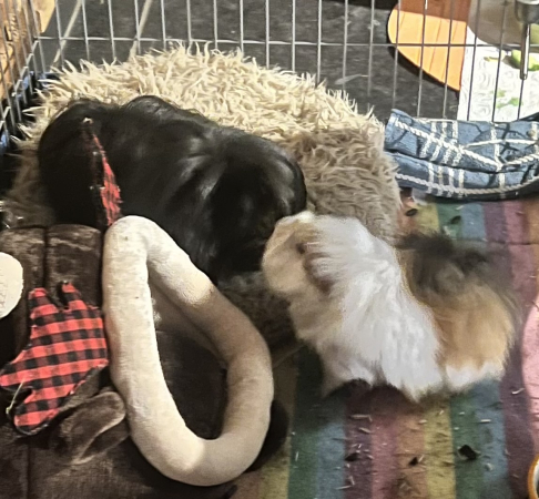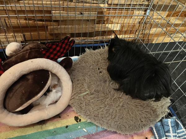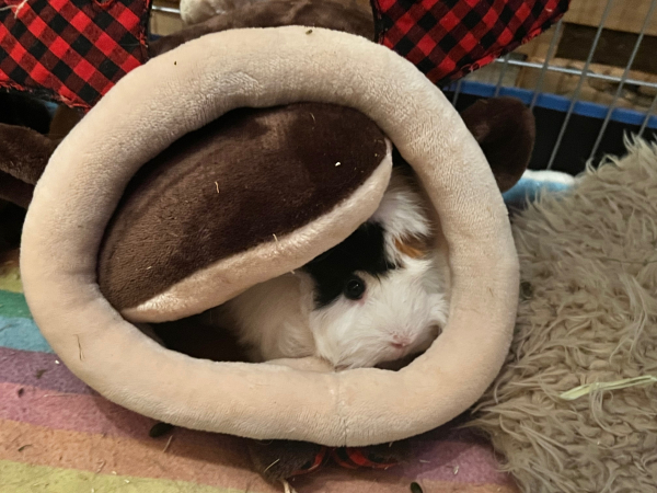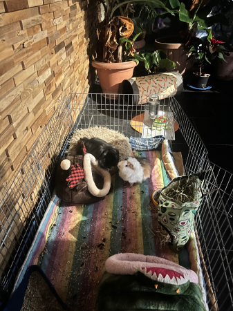 Pepita est tellement à l’aise!!! Elle mange de tout, rentre et sort de sa cage toute seule, se pose sur nous, roucoule sous les caresses… elle prend ses vitamines C sans râler. Elle cohabite avec Basquiat sans problème. Ce dernier lui fait la rumba du cochon d’Inde plusieurs fois par jour mais cela reste sans effet: elle préfère son plat de crudités. Alors il rentre tout penaud en boudant dans sa maison. Elle veut la paix et il respecte cela même s’il est très déçu que sa parade ne fonctionne pas.