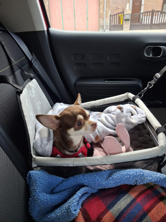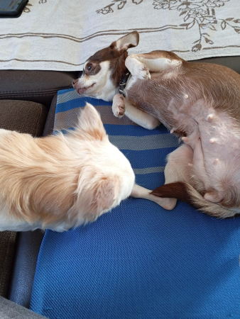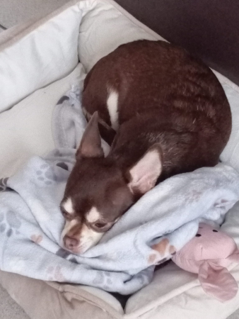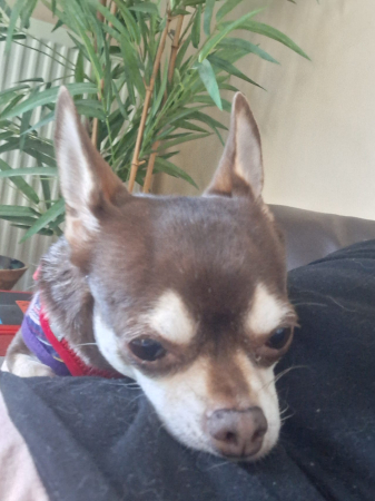 Très craintive je me suis très vite attachée à ma maîtresse Véronique. Avec les enfants ça se passe bien aussi. Y a qu'avec mon maître que ça passe moins bien, il a même déjà eu droit à des petites morsures. Heureusement il est patient et comprend très bien la vie difficile que j’ai eue. Dans le lit je me blotti contre ma "maman: alors que mon compagnon Looky préfère la compagnie de "papa " .En parlant de Looky je me montre un peu trop jalouse mais le matin on se fait des bisous. Je vais promener plusieurs fois par jour, seules les voitures qui passent me mettent mal à l'aise, mais on y travaille. Maman m'appelle la gloutonne, car dès que j'ai fini ma gamelle je me jette sur celle de mon copain Looky. Je me sens vraiment à la maison et jamais en manque de caresses et d'affection. Une grosse lèche à tout le personnel du refuge. Merci.