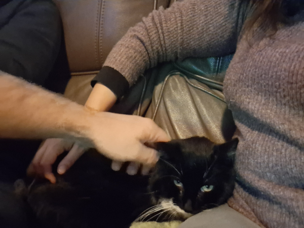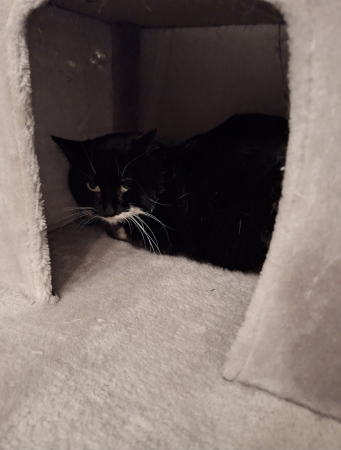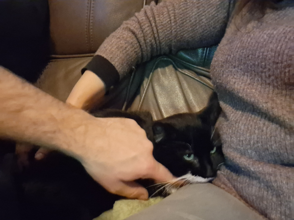 Quelques jours cachés à trouver ses marques, mais la tentation des câlins était trop forte. Il vient de plus en plus se blottir dans les bras. Il découvre ses nouveaux quartiers. Il nous offre ses tout premiers petits ronrons.